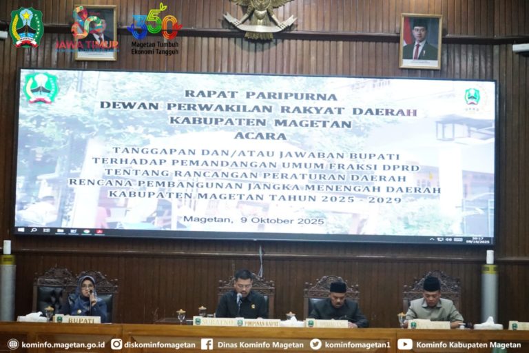 Suasana ruang rapat paripurna DPRD Kabupaten Magetan malam itu terasa penuh makna. Bupati Magetan Hj. Nanik Sumantri menyampaikan tanggapan dan jawaban atas pemandangan umum fraksi-fraksi DPRD terkait Rancangan Peraturan Daerah ...