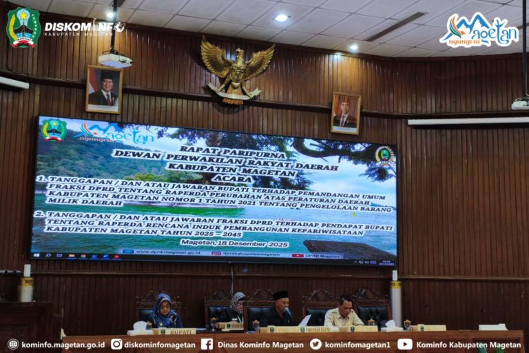 Dewan Perwakilan Rakyat Daerah (DPRD) Kabupaten Magetan melaksanakan Rapat Paripurna pada Kamis, (18/12) dengan dua agenda tanggapan. Satu diantaranya adalah agenda tanggapan dan atau jawaban Bupati terhadap Pemandangan Umum Fraksi ...