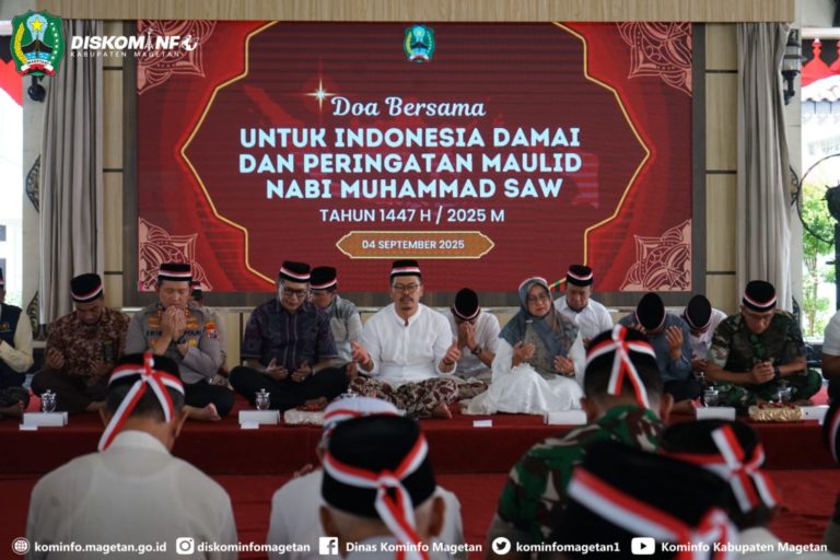 Suasana khusyuk dan khidmad terasa di Pendopo Surya Graha, Kamis (04/09/2025), saat Pemerintah Kabupaten Magetan menggelar doa bersama untuk Indonesia damai, sekaligus memperingati Maulid Nabi Muhammad SAW 1447 H/2025 M. ...