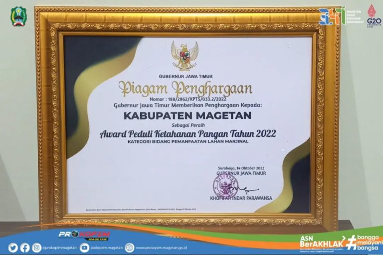 . Sahabat Prokopim, Kabar baik kembali datang untuk Kabupaten Magetan, terkait dengan hasil assesment dalam rangka Award Peduli Ketahanan Pangan kepala daerah kabupaten/kota se-Jawa Timur. . Berdasar hasil assesment tersebut, ...