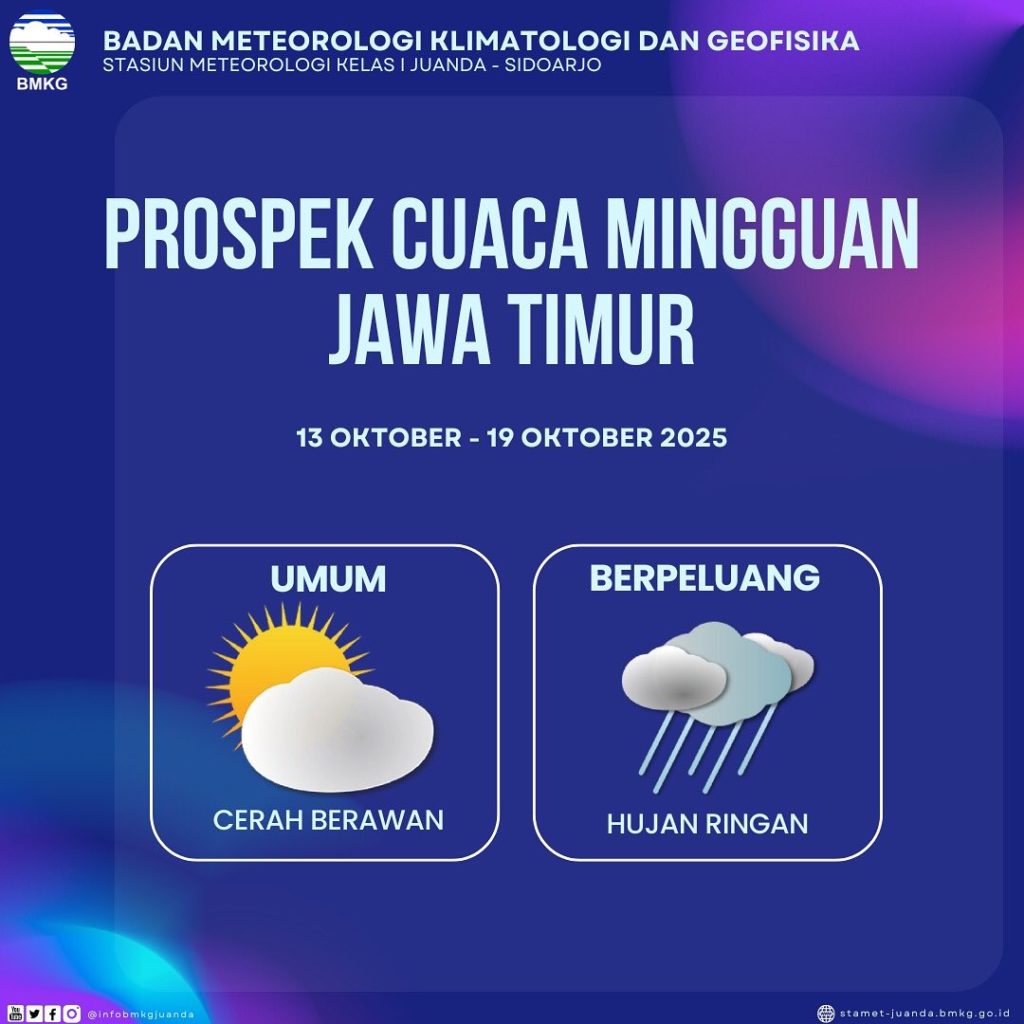 Badan Meteorologi, Klimatologi, dan Geofisika (BMKG) Juanda mengingatkan masyarakat Jawa Timur untuk meningkatkan kewaspadaan terhadap potensi cuaca ekstrem seiring bergesernya musim kemarau menuju musim hujan.