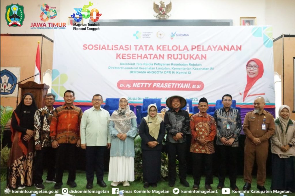 Pemerintah Kabupaten Magetan terus berkomitmen memperkuat tata kelola pelayanan kesehatan dan mendorong masyarakat untuk lebih peduli terhadap kesehatan melalui Gerakan Masyarakat Hidup Sehat (GERMAS). Hal tersebut disampaikan Bupati Magetan, Hj. Nanik Sumantri, saat memberikan sambutan dalam kegiatan Sosialisasi Tata Kelola Pelayanan Kesehatan Rujukan yang digelar oleh Direktorat Tata Kelola Pelayanan Kesehatan Rujukan, Ditjen Pelayanan Kesehatan Kementerian Kesehatan RI bersama Anggota DPR RI Komisi IX, Dr. Hj. Netty Prasetiyani, M.Si, di Gedung PGRI Kabupaten Magetan, Selasa (14/10/2025).
