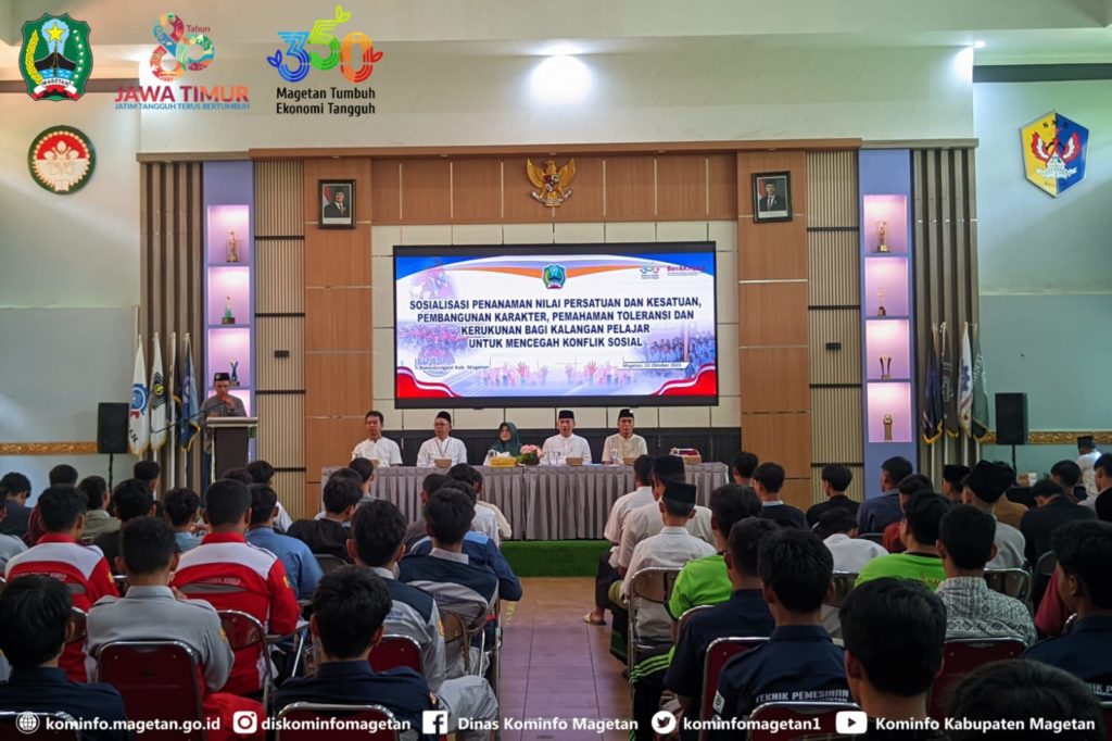 Bupati Magetan Hj. Nanik Sumantri, M.Pd kembali mengingatkan pentingnya penanaman nilai persatuan, toleransi, dan karakter kuat di kalangan pelajar. Pesan itu disampaikan dalam kegiatan sosialisasi penanaman nilai persatuan dan kesatuan di aula SMK Yosonegoro Magetan, Rabu (22/10/25).