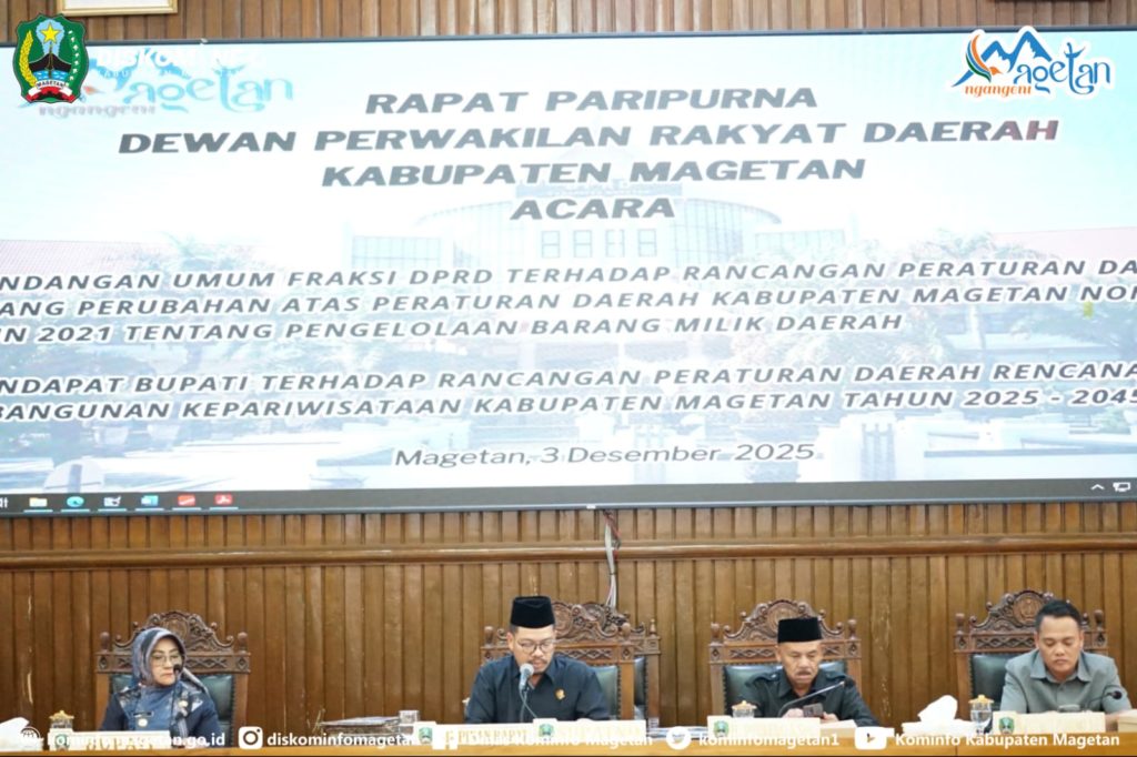 Masih dalam rangkaian Rapat Paripurna DPRD Kabupaten Magetan, Bupati Magetan Hj. Nanik Sumantri, S. Pd, M.Pd menyampaikan Pendapat Bupati terhadap Rancangan Peraturan Daerah tentang Rencana Induk Pembangunan Kepariwisataan Daerah (RIPPARDA) Kabupaten Magetan Tahun 2025–2045. Dokumen strategis jangka panjang ini digadang menjadi kompas pembangunan sektor pariwisata Magetan selama dua dekade ke depan.
