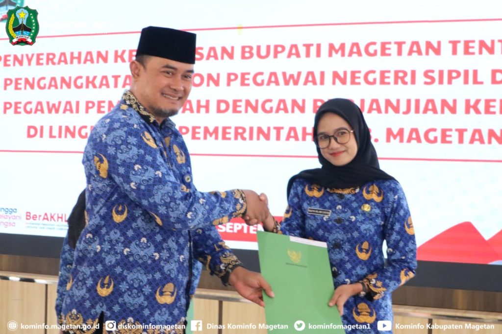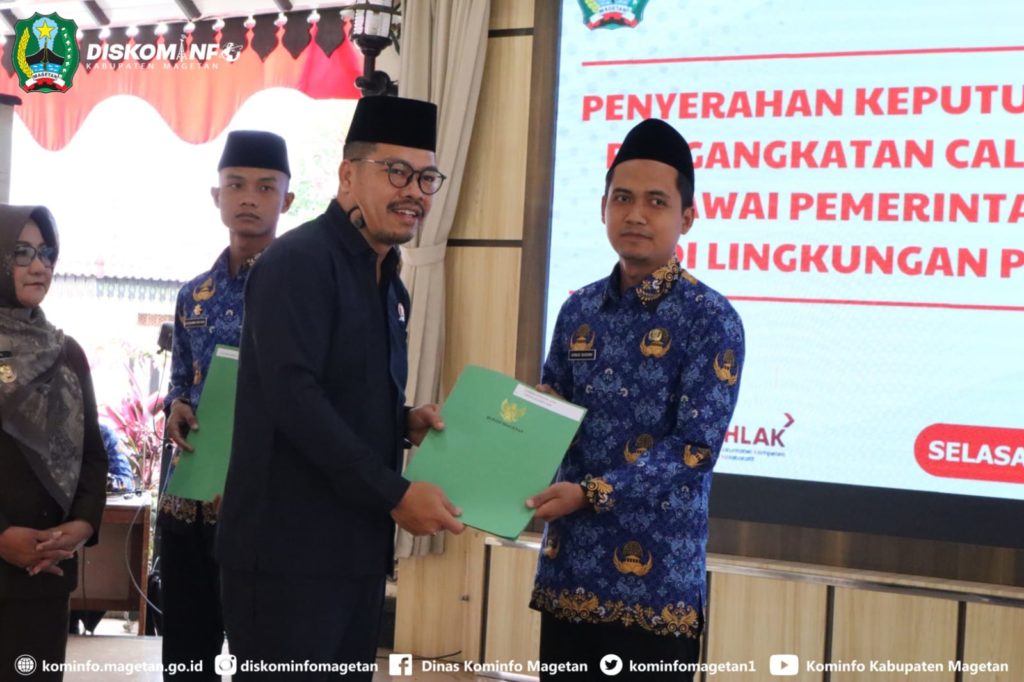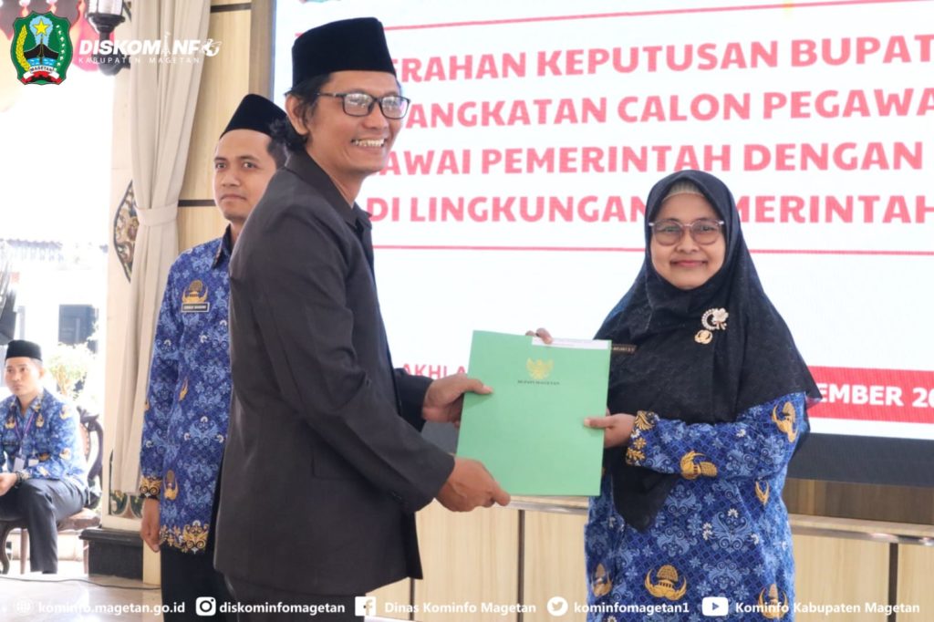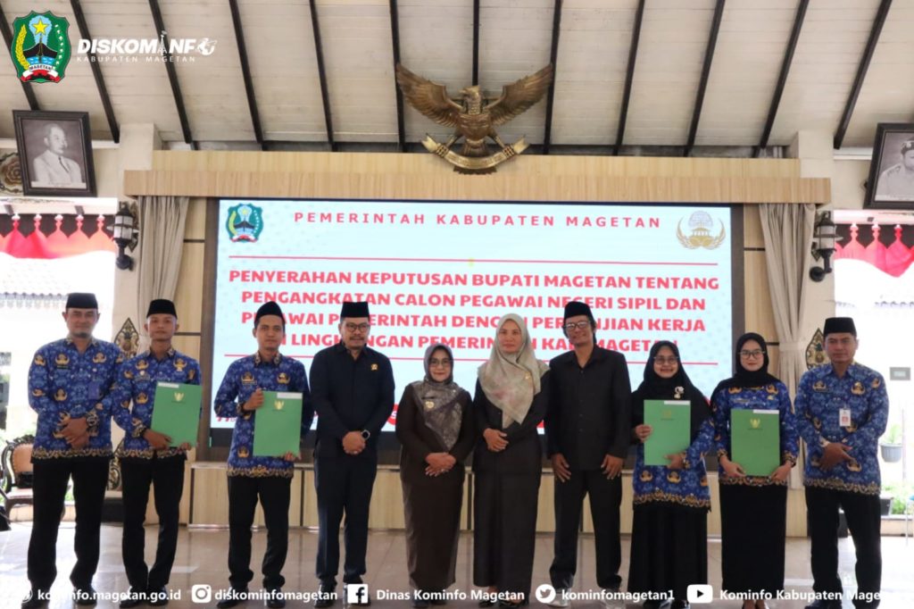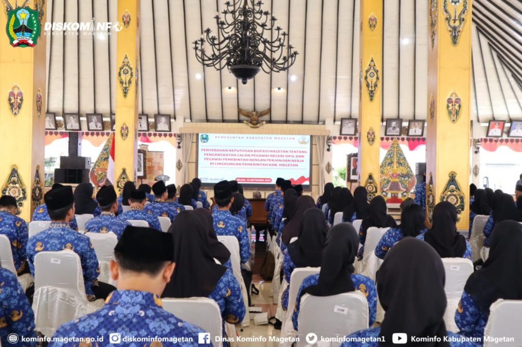 Sebanyak 192 Aparatur Sipil Negara (ASN) baru di lingkungan Pemerintah Kabupaten Magetan resmi terima Surat Keputusan (SK) Bupati tentang Pengangkatan Calon Pegawai Negeri Sipil (CPNS) dan Pegawai Pemerintah dengan Perjanjian Kerja (PPPK) Formasi Tahun 2024. Pendopo Surya Graha, Selasa (30/9/2025).