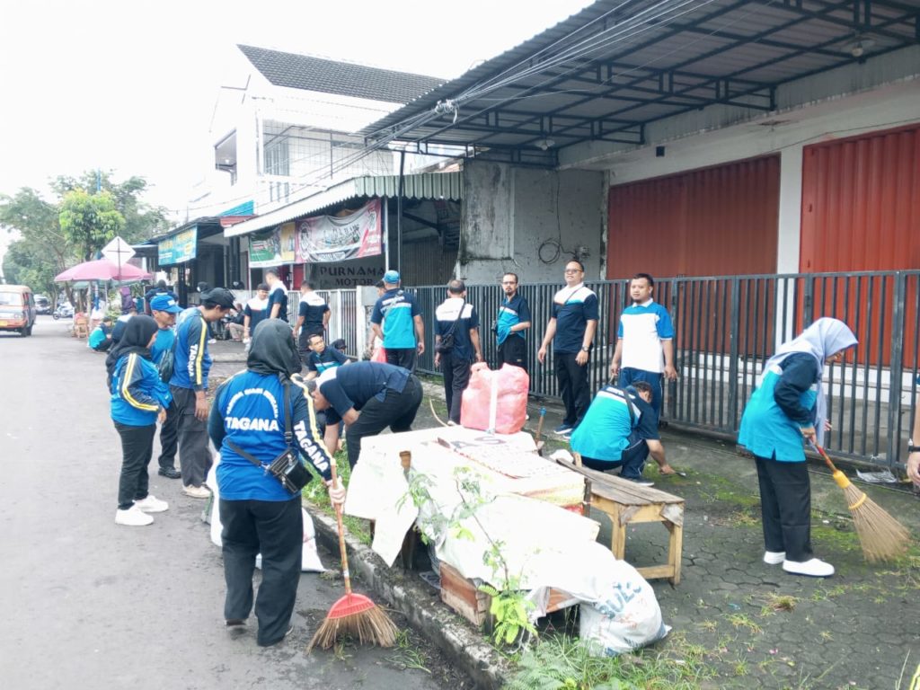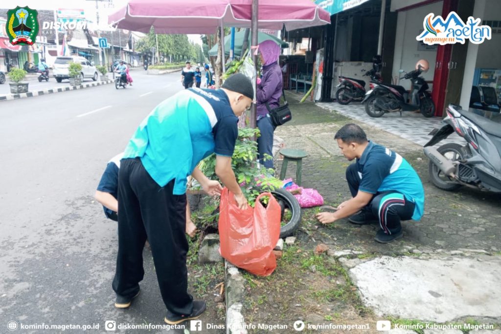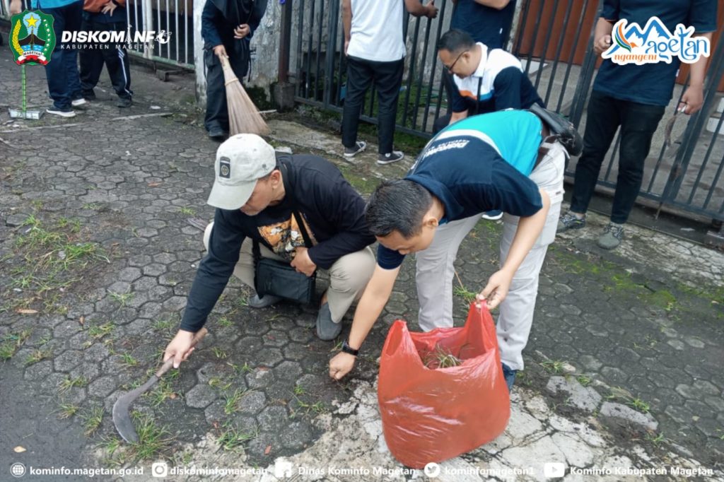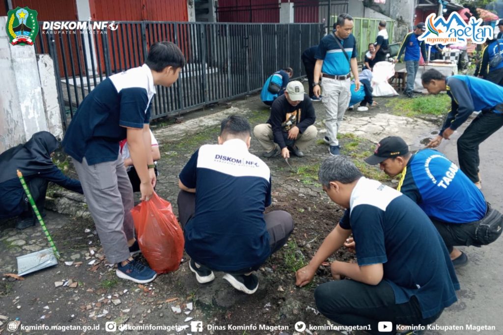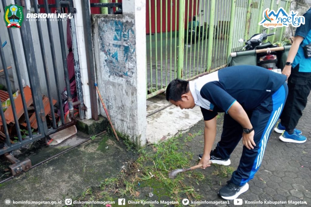 Pegawai Dinas Kominfo Kabupaten Magetan laksanakan kegiatan kerja bakti sebagai bagian Gerakan Indonesia ASRI di Kabupaten Magetan. Kegiatan yang dilaksanakan pada Jumat pagi (27/3/2026) tersebut dipusatkan di sekitar Pasar Sayur Magetan.