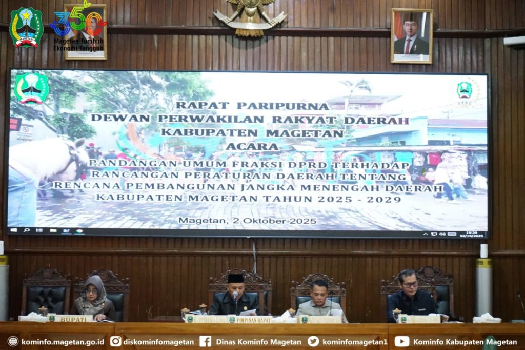 Dewan Perwakilan Rakyat Daerah (DPRD) Kabupaten Magetan menggelar rapat paripurna dengan agenda penyampaian pandangan umum fraksi-fraksi terhadap Rancangan Peraturan Daerah tentang Rencana Pembangunan Jangka Menengah Daerah (RPJMD) Kabupaten Magetan Tahun 2025–2029, Kamis (2/10/2025) di Ruang Rapat Paripurna DPRD Magetan.
