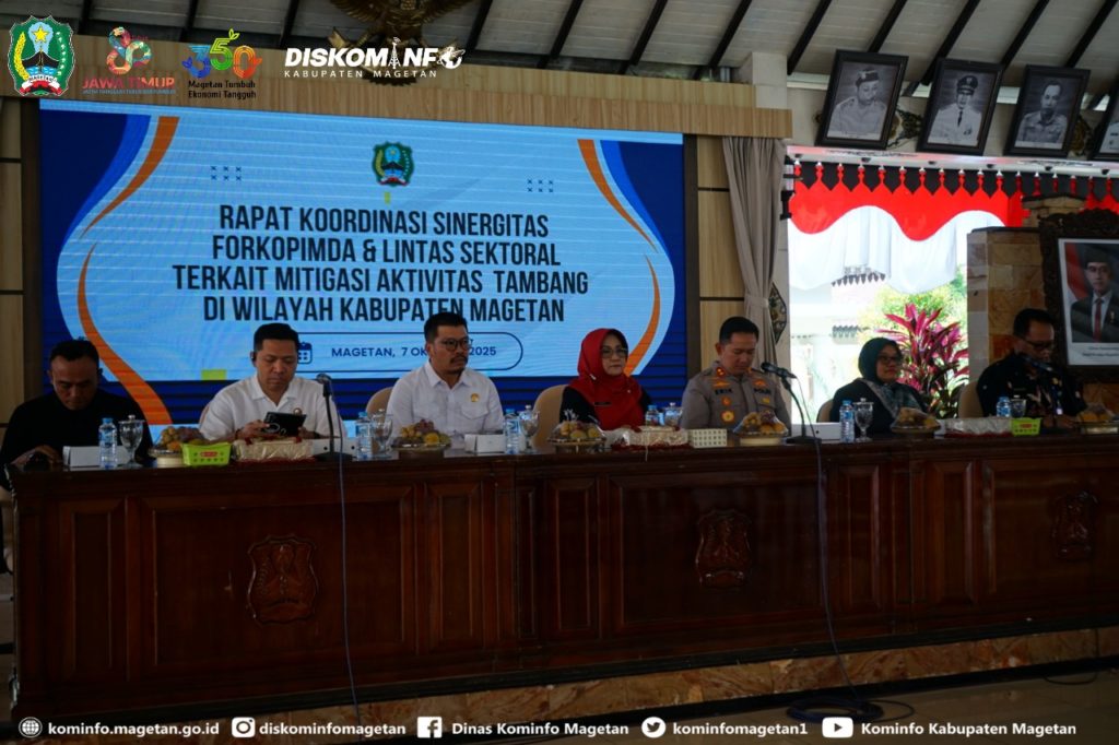 Pemerintah Kabupaten Magetan menggelar Rapat Sinergitas Forkopimda dan Lintas Sektor Terkait Mitigasi Aktivitas Tambang di Magetan. Kegiatan ini berlangsung di Pendopo Surya Graha Kabupaten Magetan, Selasa (07/10), dan dipimpin langsung oleh Bupati Magetan, Hj. Nanik Sumantri, M.Pd.