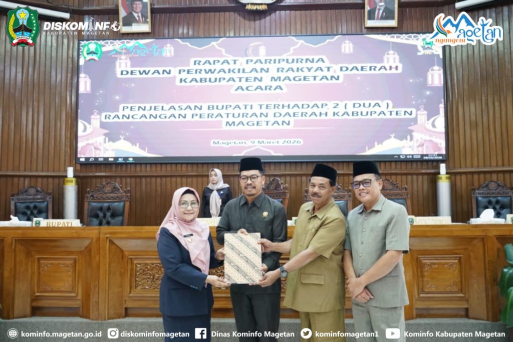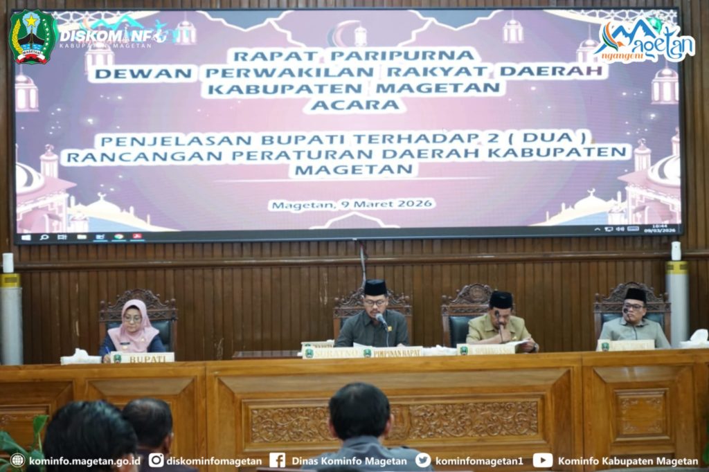 Pemerintah Kabupaten Magetan sampaikan dua Rancangan Peraturan Daerah (Raperda) dalam rapat paripurna yang digelar di Ruang Rapat Paripurna DPRD Kabupaten Magetan, Senin (9/3/26). Penjelasan raperda tersebut disampaikan langsung oleh Bupati Magetan Hj. Nanik Sumantri, M.Pd di hadapan pimpinan dan anggota DPRD.