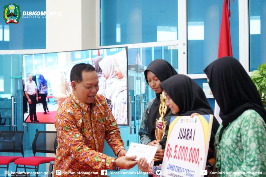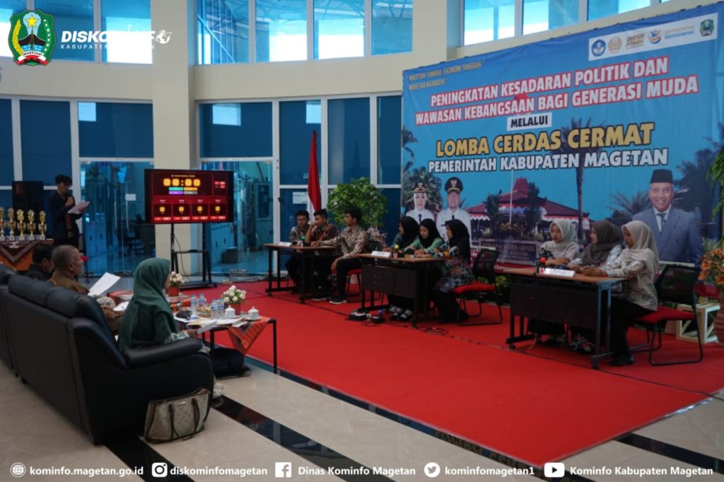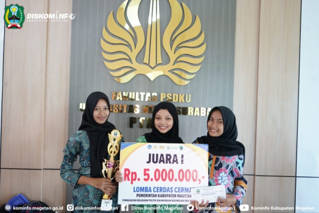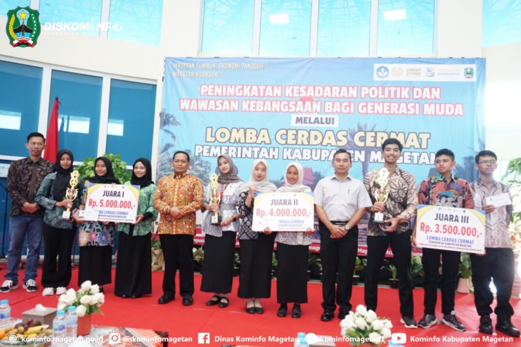 Tim SMAN 1 Magetan berhasil keluar sebagai juara Lomba Cerdas Cermat (LCC) Kesadaran Politik dan Wawasan Kebangsaan yang digelar oleh Bakesbangpol Kabupaten Magetan bekerjasama dengan Unesa Kampus 5 Magetan, Minggu (30/11). SMAN 1 Magetan berhasil menjadi juara 1 dan meraih skor tertinggi di babak final, mengungguli 2 tim lainnya yaitu MA Umdatul Falah (juara 2) dan SMK Yosonegoro (juara 3). Keberhasilan tersebut, tak terlepas dari penampilan cemerlang dan percaya diri dari anggota tim SMA 1 Magetan yang beranggotakan 3 siswi cerdas yaitu Marissa Aurellia Muzakki, Anggita Azaria Ramadhani, dan Binnar Arkartya Srihendra.