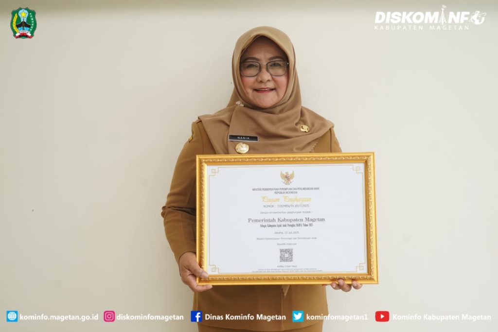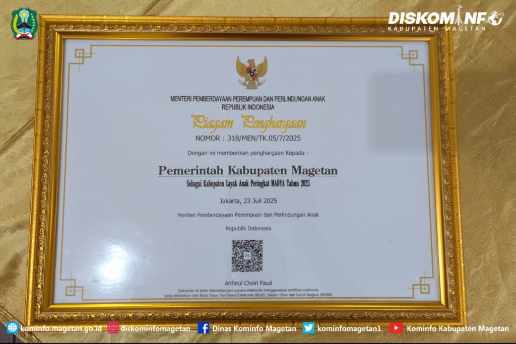 Penghargaan layak anak adalah penghargaan yang diberikan kepada pemerintah daerah yang dinilai berkomitmen dan berhasil memenuhi hak-hak anak melalui kebijakan, program, dan kegiatan, untuk menciptakan lingkungan yang aman, sehat, dan ramah bagi anak. Dalam hal ini Kabupaten Magetan mendapatkan penghargaan layak anak tingkatan “Madya” oleh Kementerian PPPA (Pemberdayaan Perempuan dan Perlindungan Anak). Senin (24/11/2025).