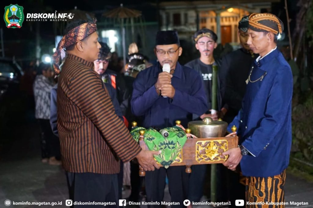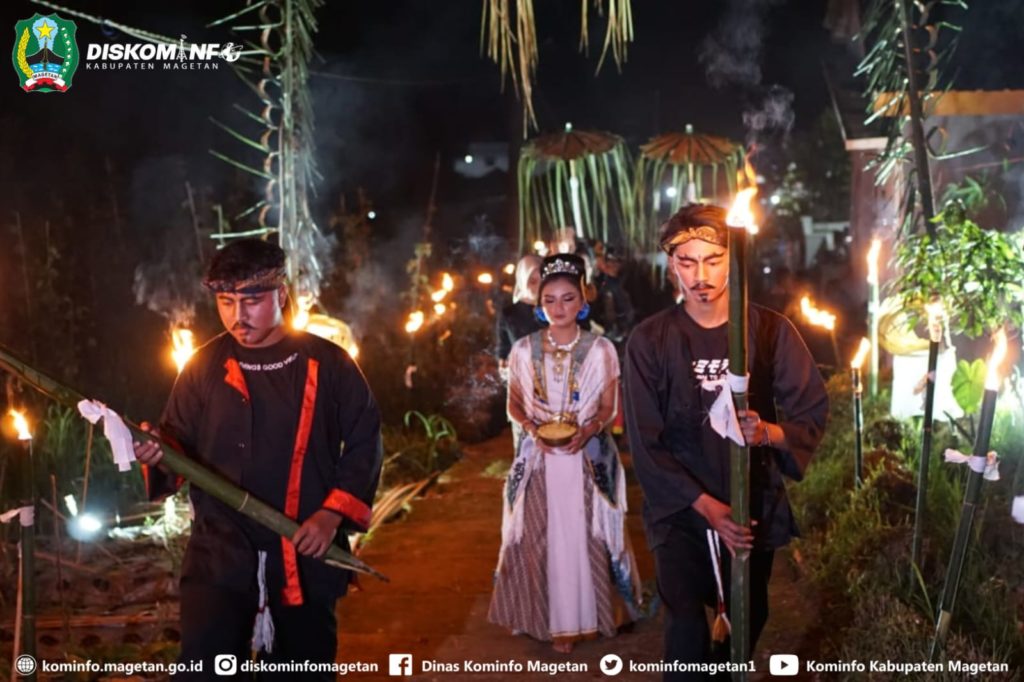 Dalam prosesinya, arak – arakan tumpeng berjalan perlahan menuju makam Ki Hajar Wonokoso. Di belakangnya para warga membawa tumpeng kecil dengan panggang, tempe, pisang , kelapa dan gula merah yang di iringi musik Tongling memecah keheningan malam yang di terangi obor berjajar di sepanjang jalan menuju makam dan menjadikan temaramnya cahaya menambah suasana sakral.