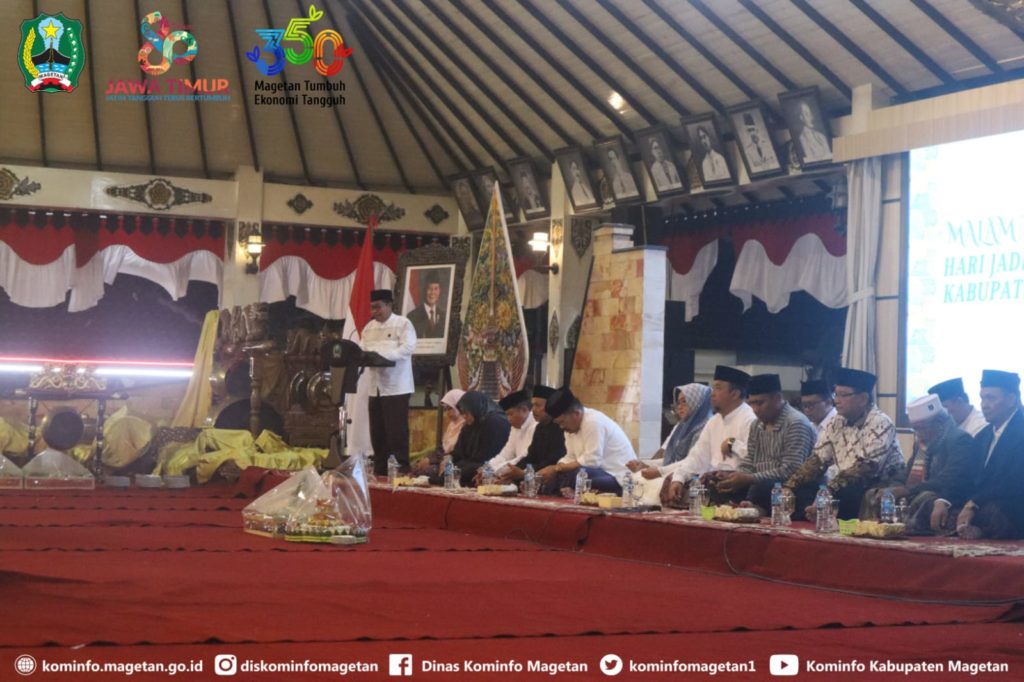 Menyambut HUT ke 350 yang jatuh pada 12 Oktober, Pemerintah Kabupaten Magetan gelar malam tirakatan hari jadi ke 350 malam ini di Pendopo Surya Graha, Sabtu (11/10/2025).