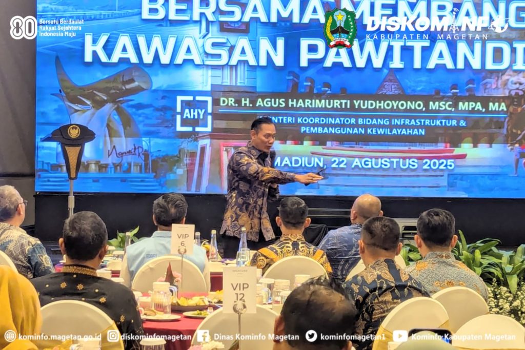 Menteri koordinator bidang infrastruktur dan pembangunan kewilayahan Agus Harimurti Yudhoyono (AHY), berkunjung ke Kota Madiun dalam rangka sarasehan pengembangan kawasan PAWITANDIROGO. Jumat (22/8/2025) di Ballrom Hotel Mercure Madiun.