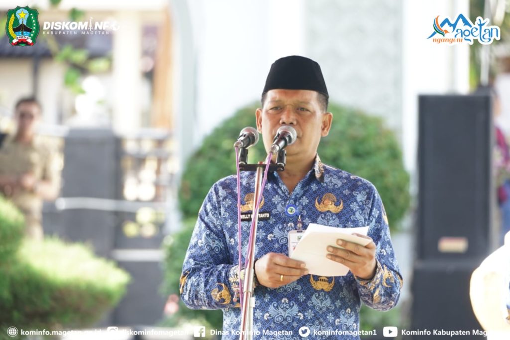 Sekretaris Daerah Kabupaten Magetan Drs. Welly Kristanto, M.Si., bertindak sebagai pembina Apel menyampaikan ucapan selamatnya kepada seluruh PPPK Paruh waktu yang dilantik hari ini dan membacakan pesan Bupati Magetan bahwa ASN Magetan untuk melaksanakan layanan publik yang profesional dan berkualitas, laksanakan kebijakan publik sesuai dengan ketentuan peraturan perundangan dan senantiasa pererat persatuan kesatuan negara Republik Indonesia