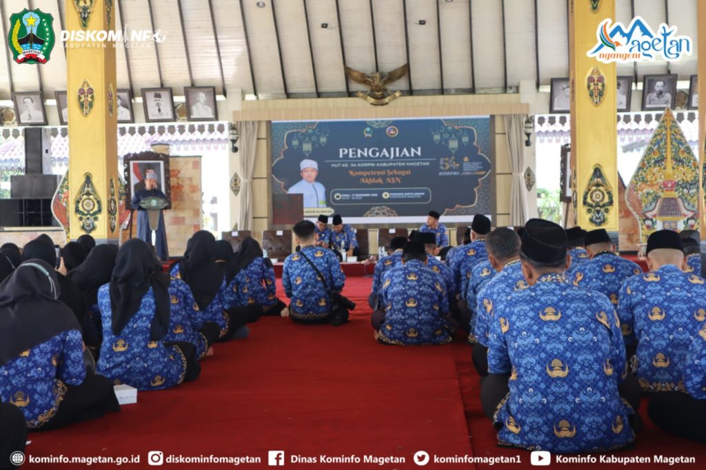 Masih dalam rangkaian peringatan Hari Ulang Tahun KORPRI ke – 54 Tahun 2025, hari ini dilaksanakan pengajian yang bertemakan, ” Kompetensi dan Akhlak Aparatur Sipil Negara ( ASN ) di Pendapa Surya Graha , Rabu 17/12/2025.