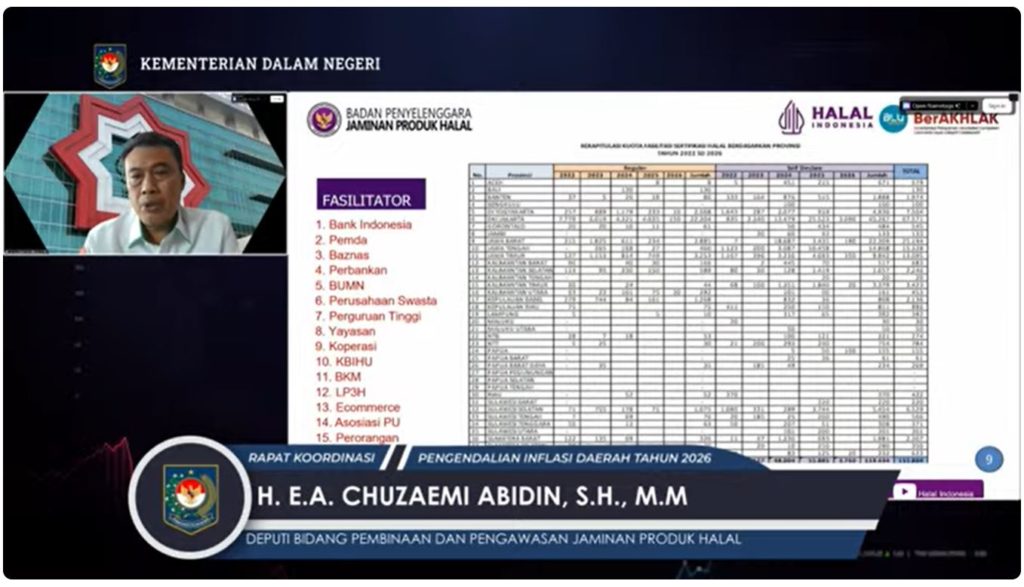 Dalam paparannya, Chuzaemi Abidin mengapresiasi dukungan berbagai pihak terhadap fasilitasi sertifikasi halal. Ia menyebutkan, sejak periode 2022 hingga 2026 telah diterbitkan sebanyak 155.804 sertifikat halal, yang pendanaannya tidak hanya berasal dari APBD, tetapi juga didukung oleh pihak lain seperti Bank Indonesia dan asosiasi swasta.