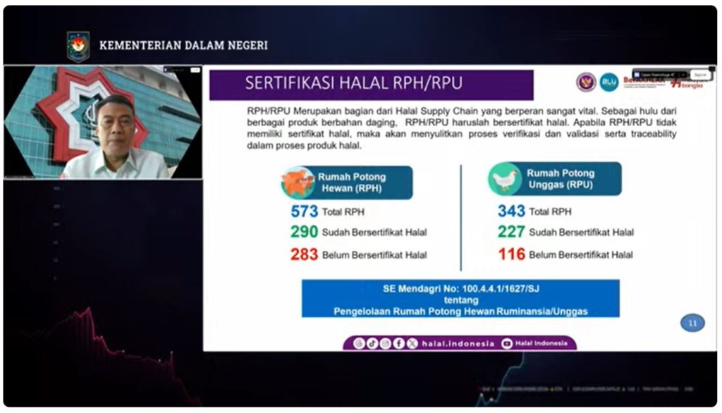 Selain itu, berdasarkan data terbaru, masih terdapat 283 Rumah Potong Hewan (RPH) ruminansia dan 116 rumah potong unggas di kabupaten/kota seluruh Indonesia yang belum memiliki sertifikat halal. Kondisi ini menjadi perhatian serius mengingat pentingnya jaminan kehalalan dalam rantai pasok pangan.