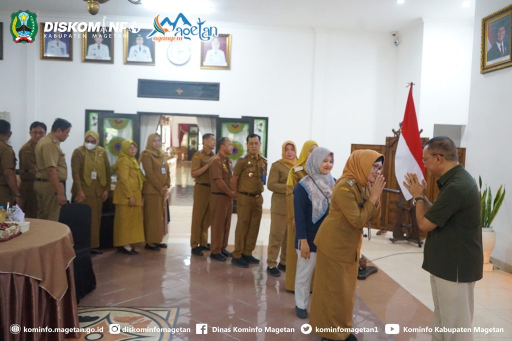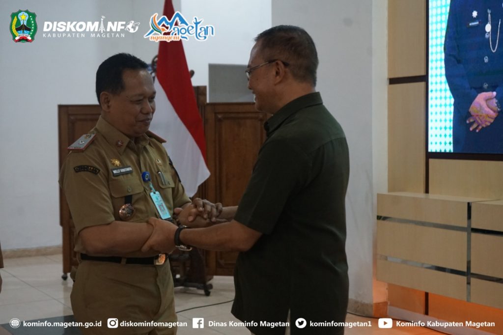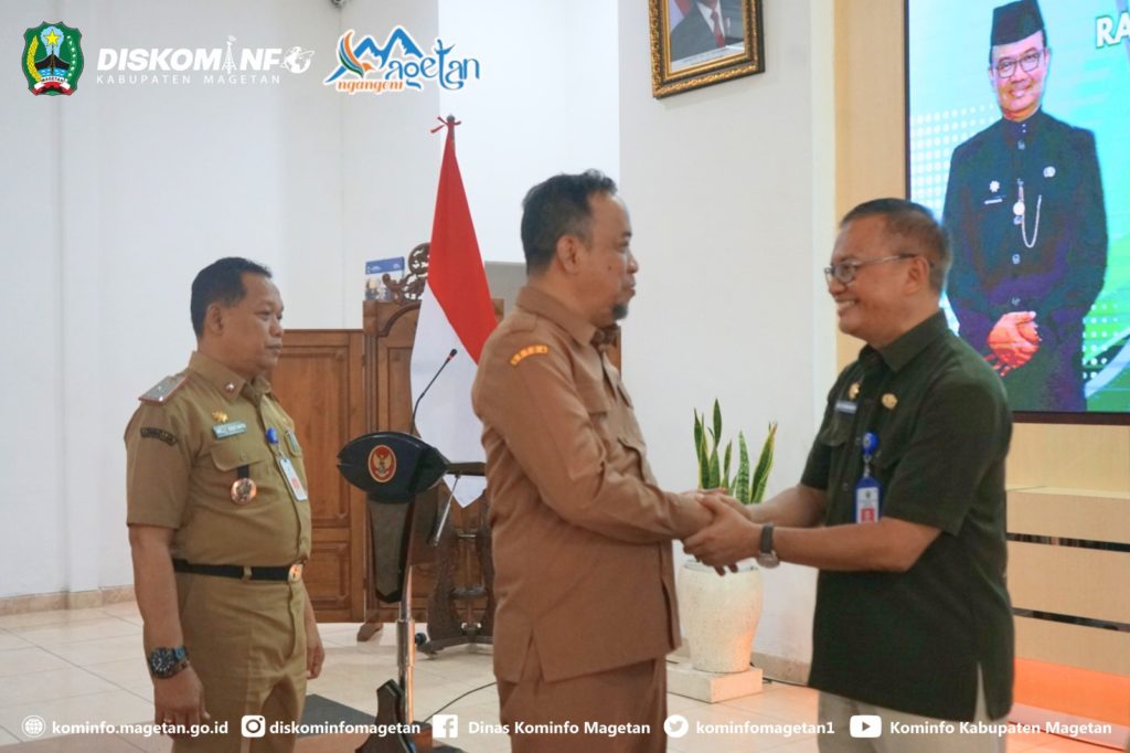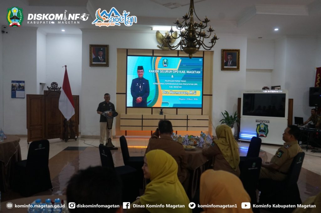 Pemkab Magetan menggelar Rakor bersama seluruh Kepala Organisasi Perangkat Daerah (OPD) dan Badan Usaha Milik Daerah (BUMD), yang dirangkaikan dengan acara pelepasan purna tugas Kepala Dinas Kependudukan dan Pencatatan Sipil (Disdukcapil) Kabupaten Magetan, Drs. Hermawan, M.Si. Kegiatan ini dilaksanakan di Ruang Jamuan Pendopo Surya Graha, Selasa (31/03/26).