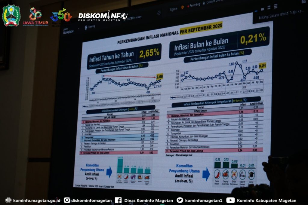 Dalam arahannya, Mendagri Tito Karnavian menyampaikan perkembangan inflasi nasional per September 2025. “Inflasi Year on Year (September 2025 terhadap September 2024) tercatat sebesar 2,65%, dengan komoditas penyumbang utama antara lain emas perhiasan, cabai merah, bawang merah, beras, dan daging ayam ras,” jelas Tito.