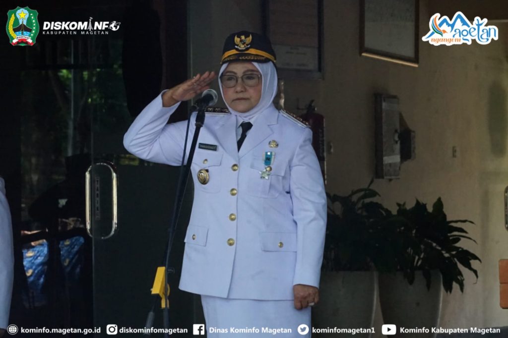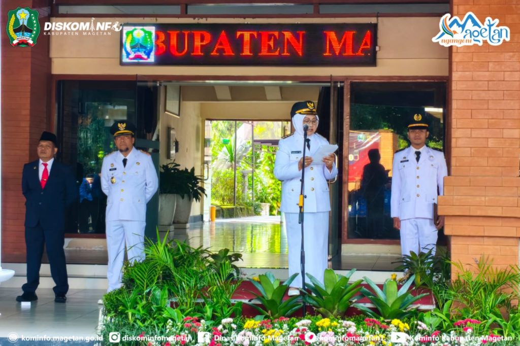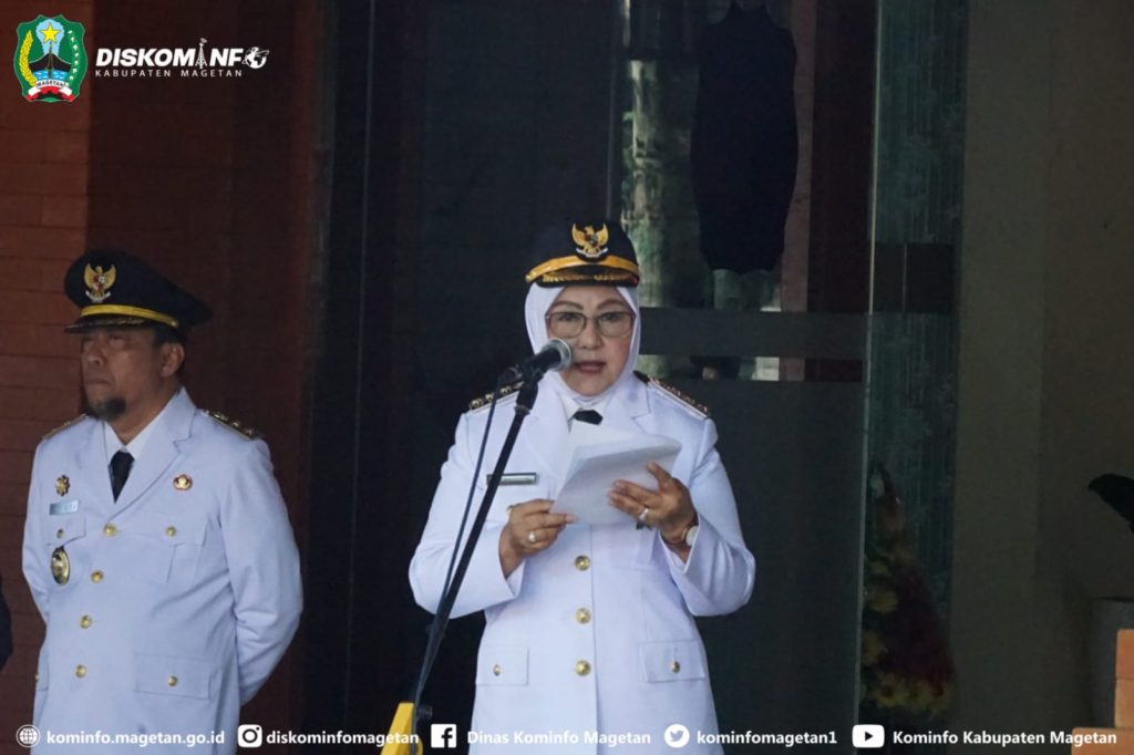 Bupati Magetan, Hj. Nanik Endang Rusminiarti, M.Pd, bacakan sambutan Menteri Dalam Negeri Muhammad Tito Karnavian saat memimpin upacara peringatan Hari Otonomi Daerah ke-30 Tahun 2026 di Halaman Kantor Sekretariat Daerah setempat, Senin (27/4/26).